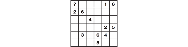 同じ列や太線で囲まれた6個のブロックの中は数字が重複しないようにして、1~6までの数字を空欄に入れたとき、(?)に入る数字は何でしょう?