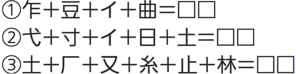 (例)のように、漢字のパーツを組み合わせて二字熟語を作ってください。 (例)木+心+里+王+目=理想