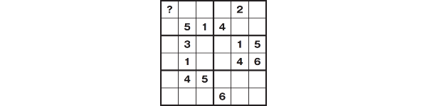 同じ列や太線で囲まれた6個のブロックの中は数字が重複しないようにして、1~6までの数字を空欄に入れたとき、(?)に入る数字は何でしょう?
