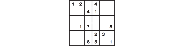 同じ列や太線で囲まれた6個のブロックの中は数字が重複しないようにして、1~6までの数字を空欄に入れたとき、(?)に入る数字は何でしょう?