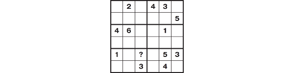 同じ列や太線で囲まれた6個のブロックの中は数字が重複しないようにして、1~6までの数字を空欄に入れたとき、(?)に入る数字は何でしょう?