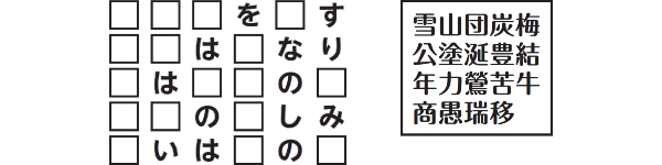 下の枠にある漢字を左の□に当てはめて、ことわざ、慣用句を五つ作ってください。すると、漢字が二つ余ります。余った漢字でできる慣用句は何でしょう?