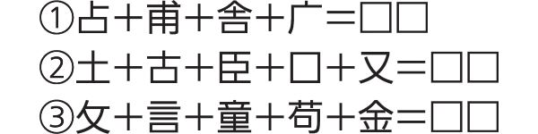 (例)のように、漢字のパーツを組み合わせて二字熟語を作ってください。 (例)木+心+里+王+目=理想