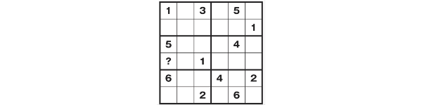 同じ列や太線で囲まれた6個のブロックの中は数字が重複しないようにして、1~6までの数字を空欄に入れたとき、(?)に入る数字は何でしょう?