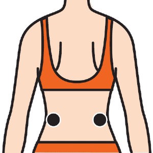 ウエストの高さで、背骨から指幅4本分外側の辺り。脚を開いて立ち、両手の親指でツボを押しながら腰をゆっくりと左右にひねりましょう。