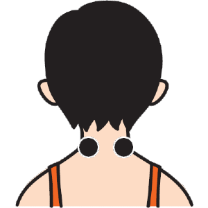 首を前に曲げたときに出っ張る骨から約1センチ上で、左右に約2センチ外側の辺り。人さし指を当て、内側に向かって刺激しましょう。