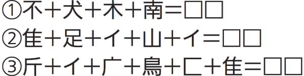 (例)のように、漢字のパーツを組み合わせて二字熟語を作ってください。 (例)木+心+里+王+目=理想